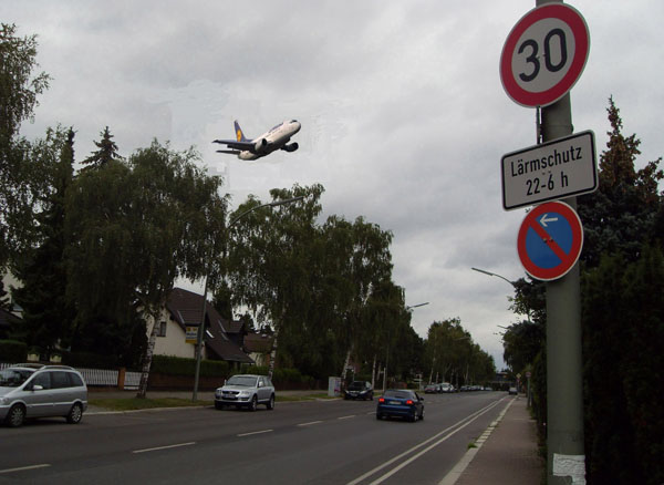 das anhängende Foto ist einerseits die Befürchtung der Bürger dass dieses Bild Realität werden wird wenn der BER erst einmal am Netz ist und zwar in vielen dicht besiedelten Gebieten in und um Berlin, andererseits enthält das Bild die Frage warum Nachtruhe offensichtlich auf Bodenfahrzeuge beschränkt sein soll, der Luftverkehr aber, nach dem Willen der politisch Verantwortlichen keinerlei Rücksicht zu nehmen hat.
