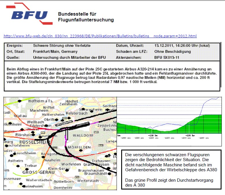 1. Hintergrund der übrigens gehäuft auftretenden Probleme sind neben den verkorksten Flugrouten die dichte Staffelung der Maschinen. Der totgeschwiegene Vorfall war keinesfalls so harmlos wie man bei einem Abstand von 1,8 km glauben könnte. Die Flugzeuge bewegten sich fast in gleicher Höhe hintereinander. Das nachfolgende Flugzeug befand sich im Gefahrenbereich der Wirbelschleppe, die bei einem A 380 einen Sicherheitsabstand von 13 km erfordert. Es sei daran erinnert, dass die Gewalt der Wirbelschleppen in Raunheim und Flörsheim regelmäßig Dächer abdeckt. Und der durchgestartete A 380 hatte selbst Probleme mit den Turbulenzen der vor ihm gelandeten Maschine.