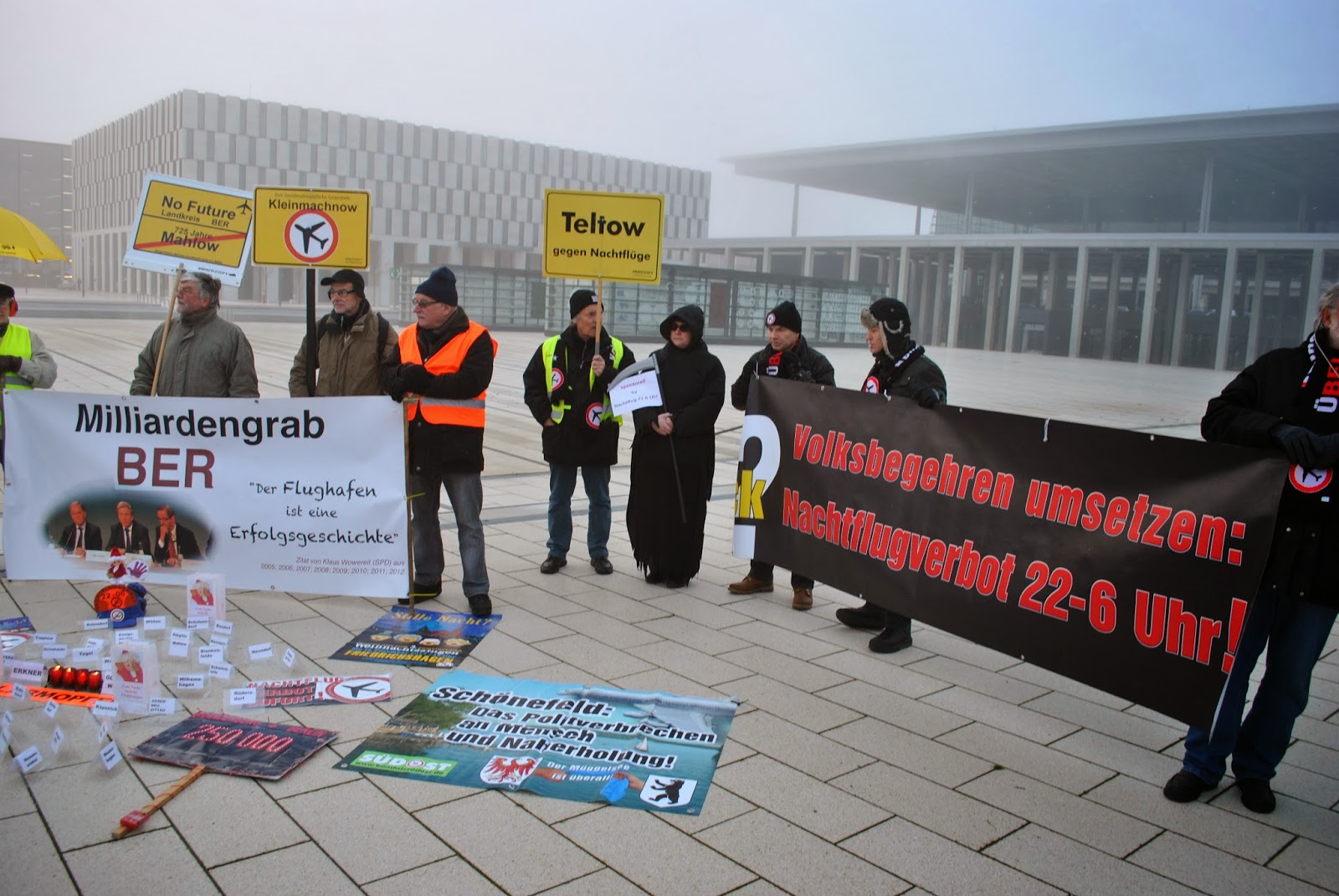 Zuvor hatten mehrere Bürgerinitiativen zu einer Mahnwache vor dem neuen Terminal am BER aufgerufen. Gefolgt waren Vertreter aus vielen betroffenen Regionen, so z.B. Erkner, Kleinmachnow, Stahnsdorf, Neuenhagen, Neu Zittau, Gosen, Lichtenrade, Großbeeren uvm.