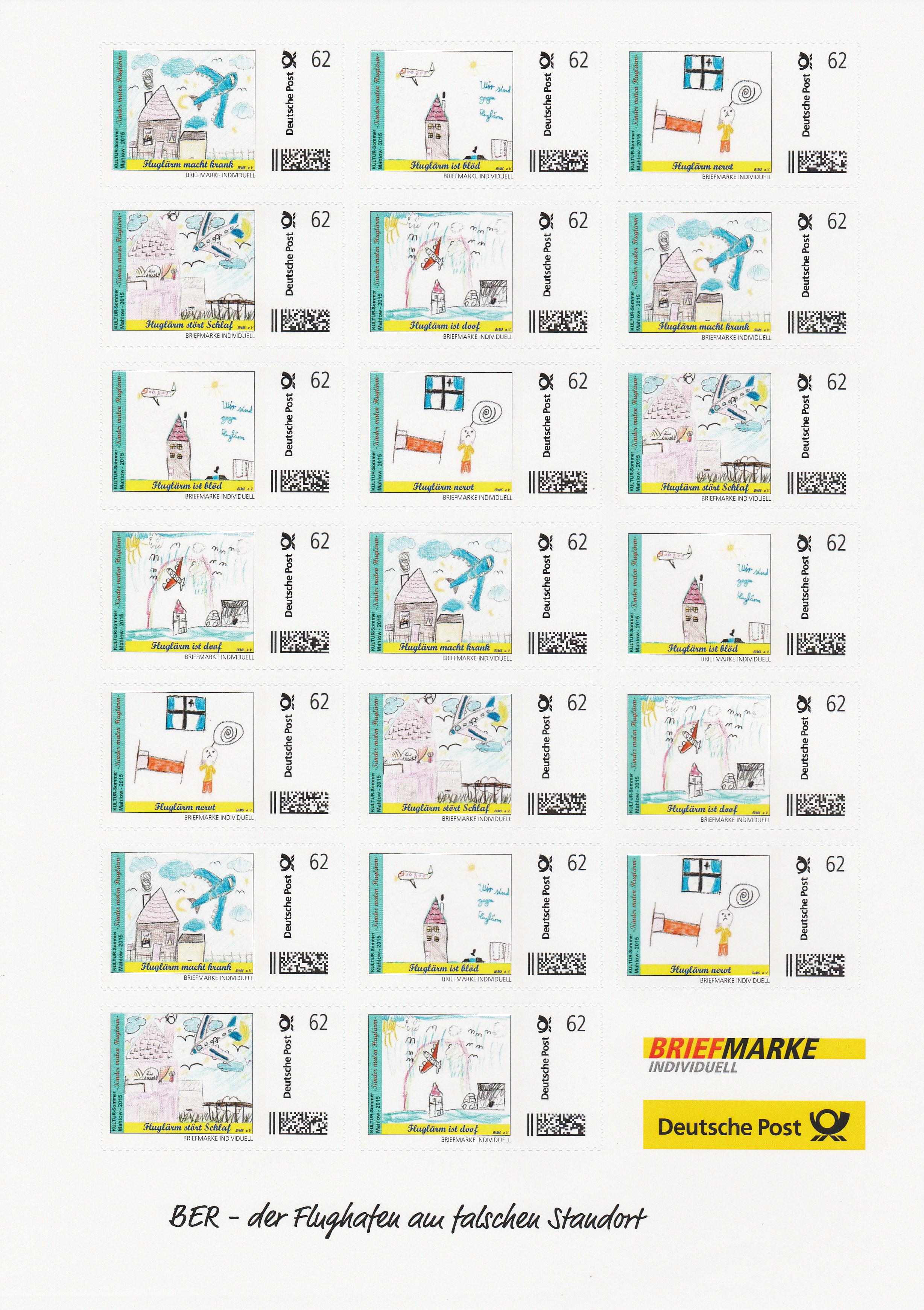 Die Benefiz-Briefmarken der Bürgerinitiative Mahlower Schriftstellerviertel (BIMS e. V.) mit den besten Motiven des Malwettbewerbs „Kinder malen Fluglärm“ sind inzwischen in einer 1. Auflage von der Deutschen Post gedruckt worden und können jetzt käuflich erworben werden. Die BIMS wird sie, jetzt beginnend beim Gemeindesportfest am nächsten Wochenende, und an allen Ständen, die sie demnächst zur Unterstützung des Volksbegehrens gegen eine 3. Start- und Landebahn im Gemeindegebiet aufstellt, den